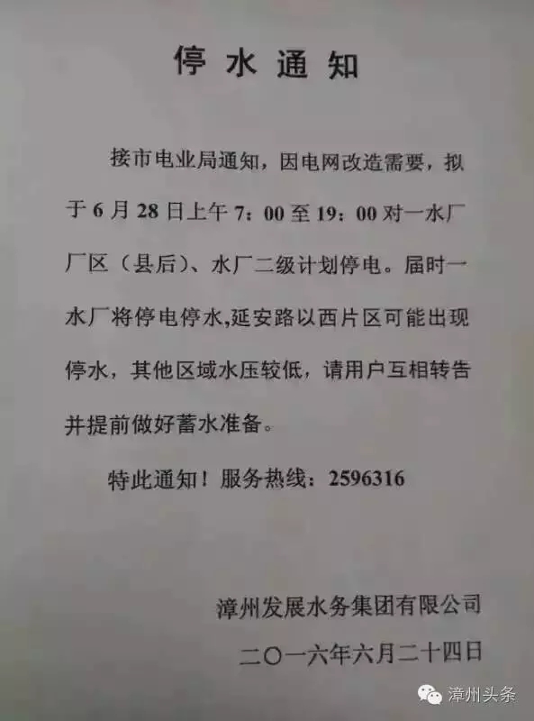 根據(jù)漳州市電業(yè)局通知,因電網(wǎng)改造需要,6月28日上午7:00至19:00,將對(duì)漳州一水廠廠區(qū)(縣后)、水廠二級(jí)計(jì)劃停電。屆時(shí),一水廠將停電停水,延安路以西片區(qū)可能出現(xiàn)停水,其他區(qū)域水壓較低,請(qǐng)用戶(hù)互相轉(zhuǎn)告并提前做好蓄水準(zhǔn)備。